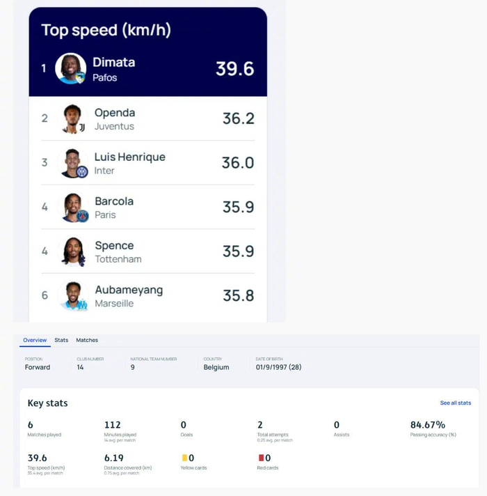 中超升班马重庆铜梁龙宣布比利时前锋迪马塔来投。值得一提的是,迪马塔最高速度达39.6公里/小时,在本赛季欧冠所有参赛球员中位列第一,力压尤文快马奥蓬达。附 25/26赛季欧冠最快球员TOP101 迪马塔 帕福斯(现重庆铜梁龙) 39.6公里/小时2 奥蓬达 尤文 36.2公里/小时3 路易斯-恩里克 国米 36公里/小时4 巴尔科拉 巴黎圣日耳曼 35.9公...